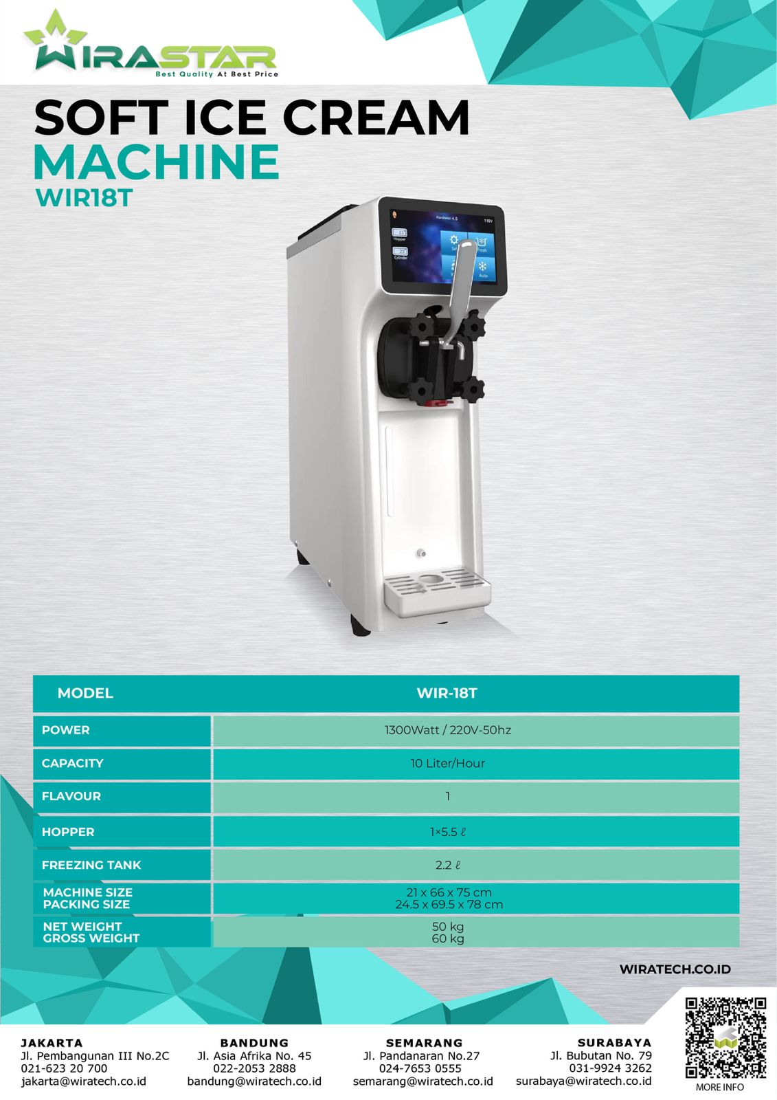 Mesin es krim ini mempunyai kemampuan mengolah 1 flavor (rasa). Mesin es krim WIR18T – 1 Table Type menggunakan kompresor tipe terbaru dengan system preooling. Sehingga akan terasa lebih awet, dengan hasil yang lebih maksimal.